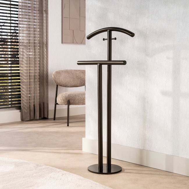 Dressboy Lema is ontworpen voor wie functionaliteit en elegantie wil combineren in de slaapkamer, dressing of hal. Het ontwerp is volledig uitgevoerd in gepoedercoat staal met een bronstint, waardoor hij perfect aansluit bij een hotel chique of modern interieur. Dankzij de slanke lijnen oogt de dressboy stijlvol zonder te veel ruimte in te nemen.