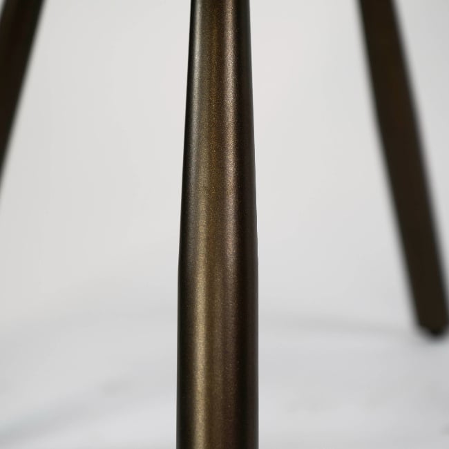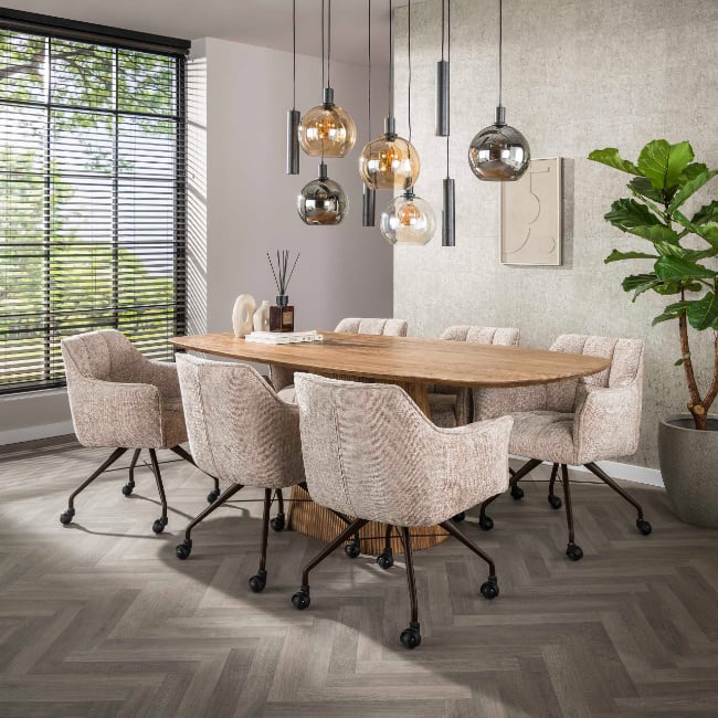 Het onderstel is uitgevoerd in gepoedercoat staal in een warme bronzen kleur en voorzien van praktische wieltjes. Hierdoor schuif je de stoel eenvoudig aan of verplaats je hem moeiteloos. De zachte zandkleurige Hoven stof geeft een rustige, natuurlijke uitstraling die perfect past binnen moderne, hotel chique en industriële interieurs.