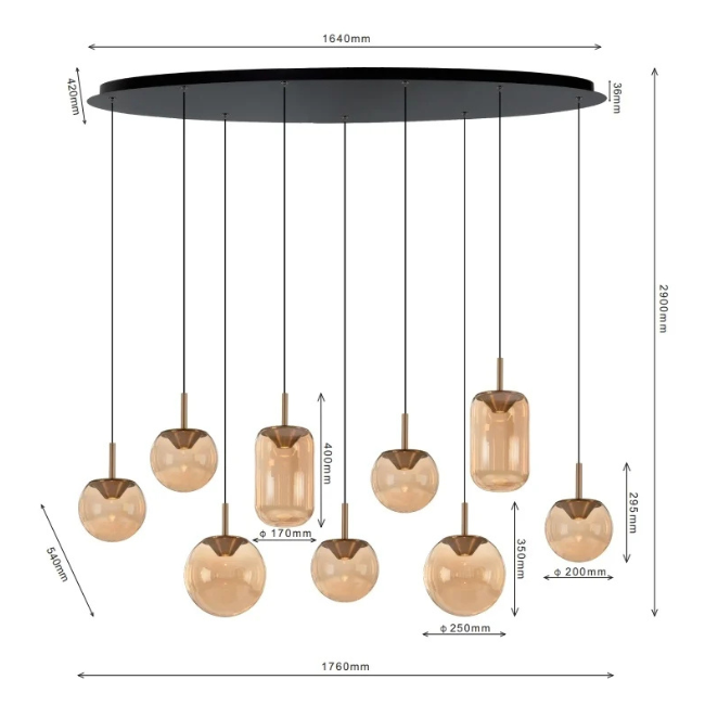 De combinatie van metaal en glas zorgt voor een luxe uitstraling, terwijl het amberglas het licht zacht filtert en warmte toevoegt aan de ruimte. Met een royale lengte van 165 cm en een hoogte tot 150 cm is deze hanglamp perfect geschikt boven een grote eettafel, kookeiland of vergadertafel.
