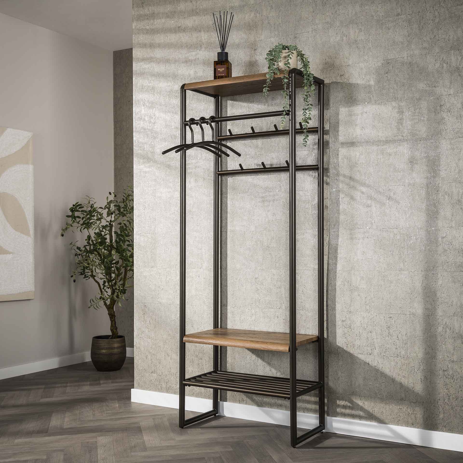 De hoedenplank en schoenenplank zijn uitgevoerd in een fraaie eikenhoutlook met een subtiele drift brown tint. Hierdoor ontstaat een natuurlijke balans tussen industriële stevigheid en huiselijke warmte. De praktische indeling met een roede en zeven haken biedt volop ruimte voor jassen, tassen en accessoires, waardoor de entree altijd opgeruimd blijft.