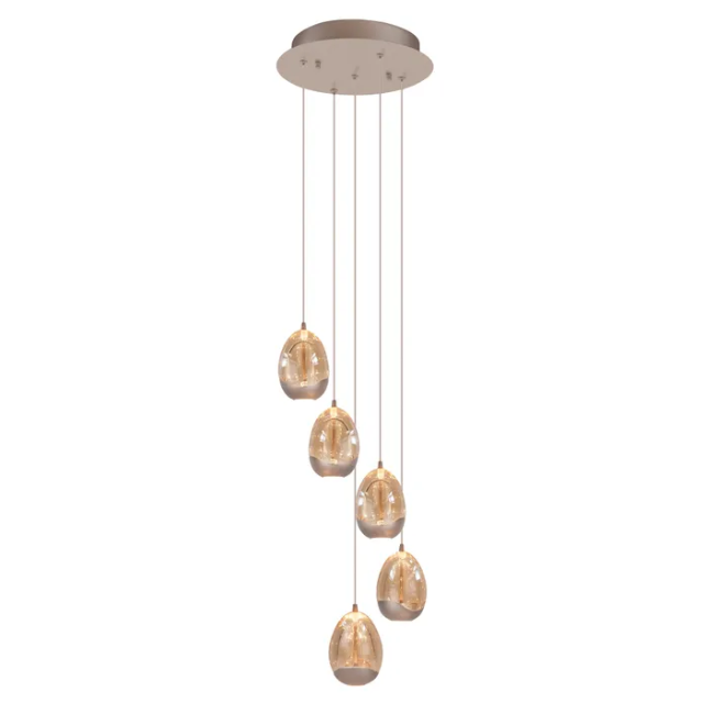 De Champagne Egg 5-lichts hanglamp met getrapt design is een elegante blikvanger die direct sfeer toevoegt aan je interieur. De vijf lichtpunten hangen op verschillende hoogtes, wat zorgt voor een speels en dynamisch effect met een luxe uitstraling.