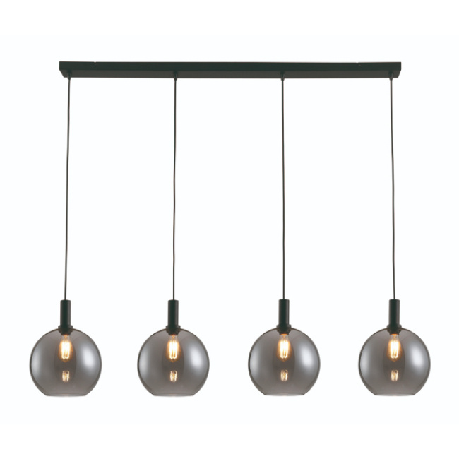 De moderne Chandra 4-lichts hanglamp is een stijlvolle toevoeging aan elk eigentijds interieur. De lamp bestaat uit vier prachtige ronde bollen van smoke glas, die een luxe en warme sfeer creëren zodra het licht wordt ingeschakeld. Het zwarte armatuur geeft het geheel een strakke en moderne uitstraling, waardoor de lamp perfect past binnen diverse woonstijlen.