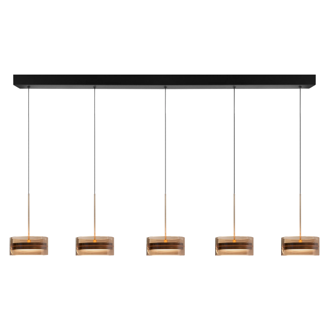 De hanglamp Enzo 5-lichts in brons is een moderne en stijlvolle toevoeging aan je interieur. De vijf strak vormgegeven lichtpunten hangen in een rechte lijn aan een slanke plafondbalk, wat zorgt voor een rustig en elegant geheel.