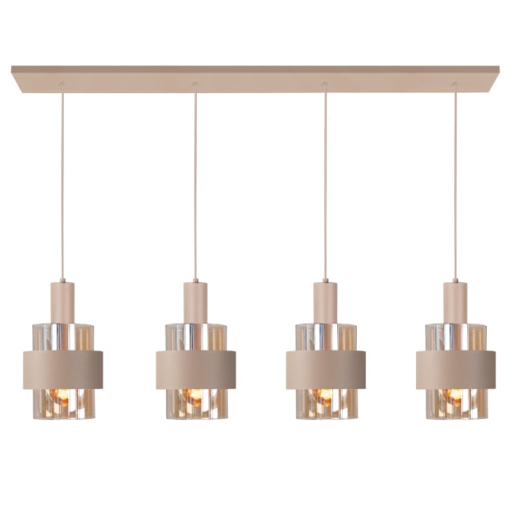De Marrone hanglamp 4-lichts zandkleurig van Highlight brengt warmte en elegantie samen in een modern ontwerp. De zachte zandkleur in combinatie met de bruine glazen kappen geeft deze lamp een luxueuze, sfeervolle uitstraling die perfect past in een Scandinavisch of hotel chique interieur.