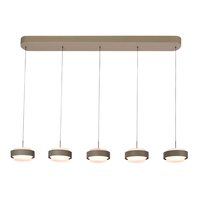 De Puleggia 5-lichts hanglamp in olijfgroen is een moderne eyecatcher die direct warmte en karakter toevoegt aan je interieur. De slanke balk van 140 cm met vijf hangende lichtpunten zorgt voor een stijlvol en rustig geheel, perfect boven een lange eettafel of kookeiland.