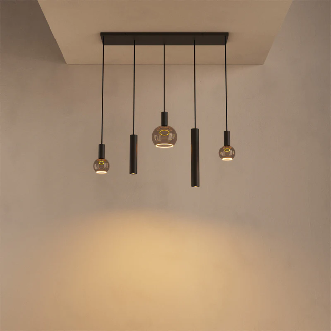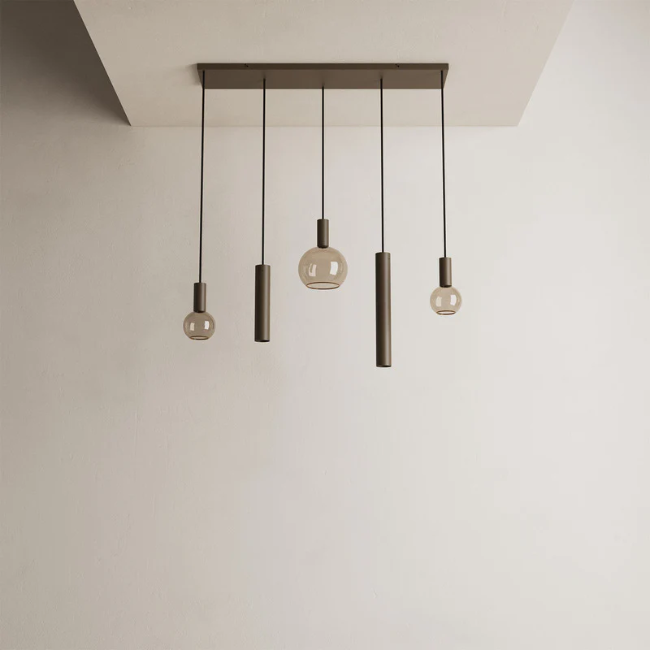 De Riva 5-lichts hanglamp in de kleur Platinum is een modern designstatement dat elegantie, speelsheid en functionaliteit combineert. Dit handgemaakte armatuur van Ztahl valt op door de verfijnde afwerking, de luxe kleurtoon en de afwisseling tussen cilindervormige kokers en ronde glazen bollen. Door de verschillende lengtes ontstaat een dynamische compositie die zowel rust als spanning in het interieur brengt.