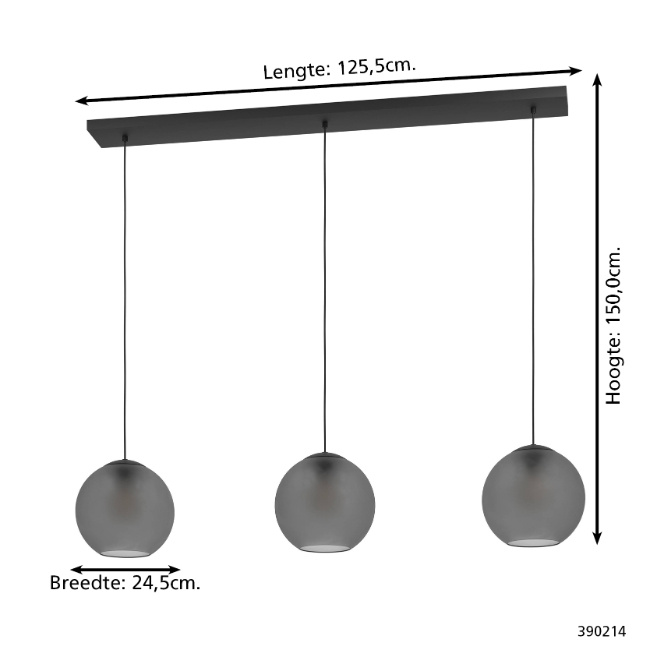 De lamp heeft drie E27 fittingen, wat je de vrijheid geeft om een lichtbron naar keuze te installeren, zoals energiezuinige LED-lampen tot 25W. De matzwarte glazen kappen verzachten het licht en creëren een warme, uitnodigende sfeer in de ruimte. Dit maakt de hanglamp Arangona uitermate geschikt voor zowel gezellige diners als een sfeervol verlichte leefruimte.