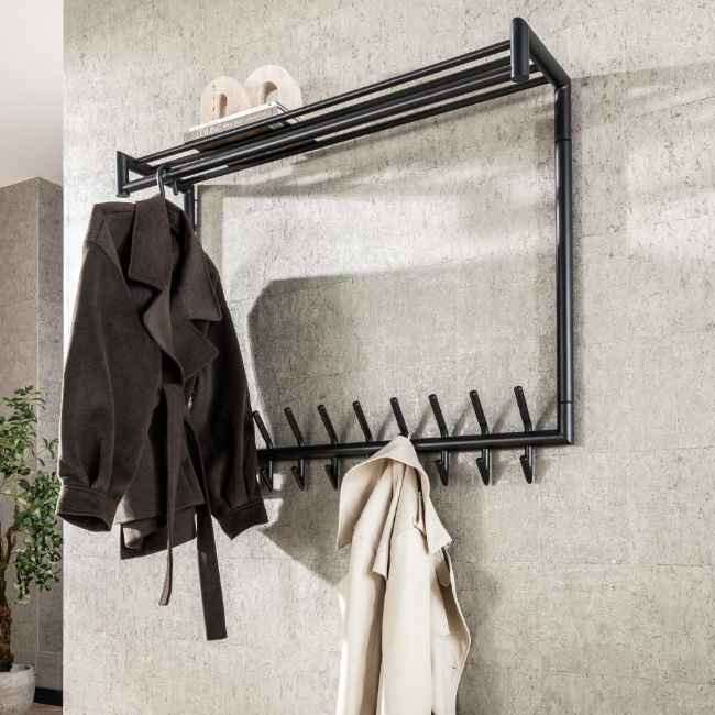 De kapstok Tiyu in de 20-haaks uitvoering biedt optimale opbergruimte met een stijlvol industrieel ontwerp. Het frame is gemaakt van donkergrijs mat gepoedercoat staal, wat zorgt voor een robuuste en moderne uitstraling. De ronde buizenstructuur van de hoedenplank biedt zowel stevigheid als een eigentijdse look.