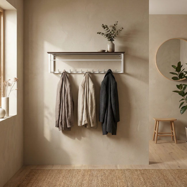 Dankzij de 11 stevige haken is er volop ruimte voor jassen, tassen en accessoires. De hoedenplank van gelakt mangohout biedt extra plek voor sjaals, hoeden of decoratieve items en maakt het geheel zowel functioneel als sfeervol.