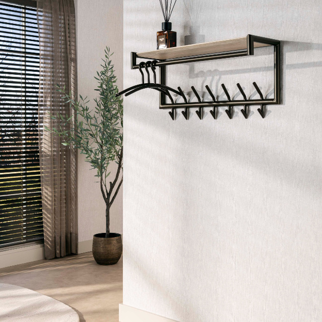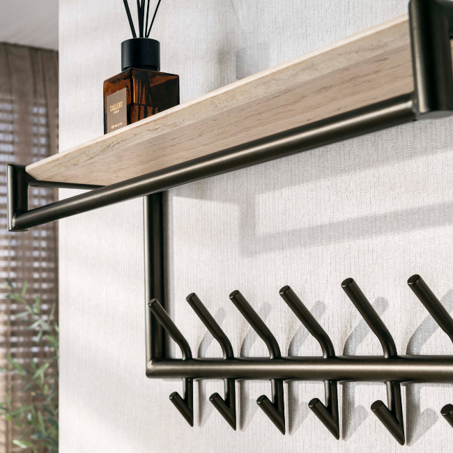 Met maar liefst 14 haken biedt dit model volop ruimte voor jassen, tassen, sjaals en accessoires. De schuine haken zorgen ervoor dat kleding stevig blijft hangen en overzichtelijk geordend blijft. De royale travertin bovenplank biedt extra opbergoppervlak voor mandjes, hoeden of decoratieve items, waardoor de kapstok zowel praktisch als sfeervol is.