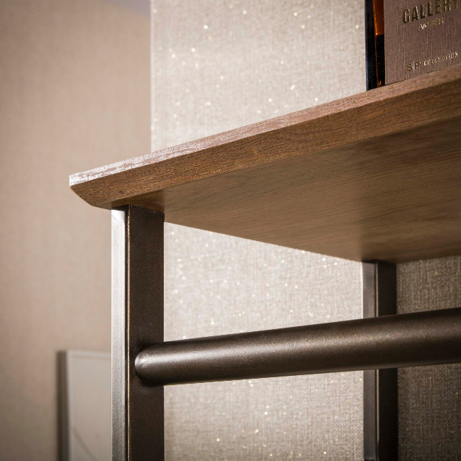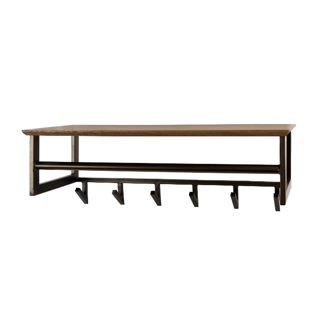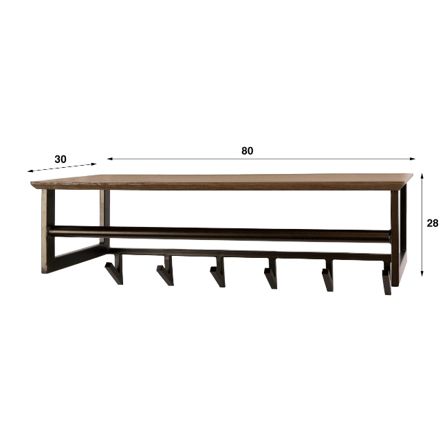 De kapstok Peru heeft een modern en functioneel ontwerp dat perfect past in de hal of entree. Het stevige stalen frame in bronzen kleur wordt gecombineerd met een hoedenplank in drift brown eikenhout-look, wat zorgt voor een warme en stijlvolle uitstraling.