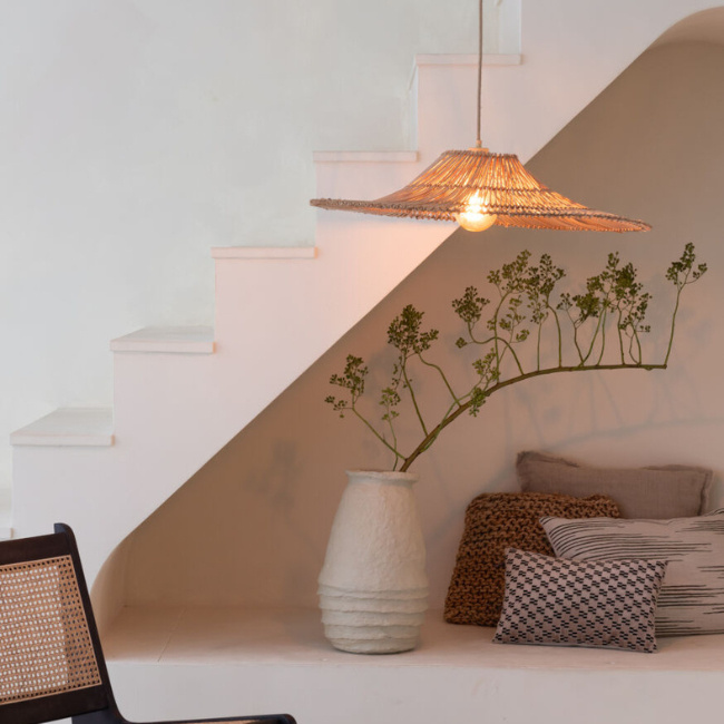 De Hanglamp Cancun 1-lichts naturel is een echte sfeermaker voor boven de eettafel, in de woonkamer of onder een veranda. Het open vlechtwerk in natuurlijke kleur en het brede, aflopende ontwerp geven de lamp een luchtig en rustgevend karakter. Perfect voor wie houdt van een Japandi of landelijke woonstijl.
