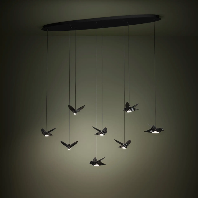 De design hanglamp Paratebueno 8-lichts in zwart ovaal combineert modern design met een speels en elegant detail. De decoratieve vogeltjes geven de lamp karakter, terwijl het zwarte metalen frame zorgt voor een strakke en eigentijdse uitstraling.