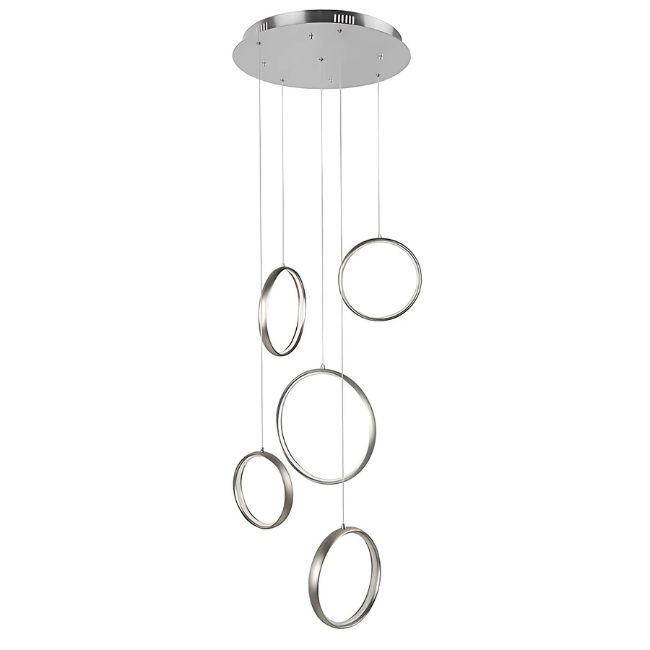 Breng een moderne en minimalistische sfeer in je interieur met de hanglamp Olympia 5-lichts in zilver. De vijf LED-ringen hangen op verschillende hoogtes en zorgen voor een uniek lijnenspel in hoge ruimtes. Ideaal voor een vide, hal of woonkamer met veel hoogte.