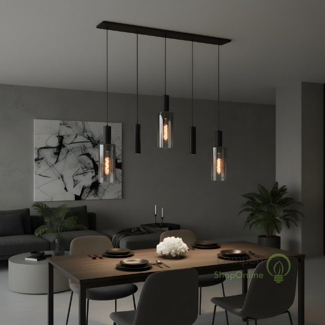 De hanglamp Perugia past door de smoke gekleurde glazen en de zwart afgewerkte kokers prachtig in moderne, industriële en hotel chique interieurs. Ook biedt de hanglamp direct licht op uw tafel wat het ideaal maakt voor boven kookeilanden een eettafels.