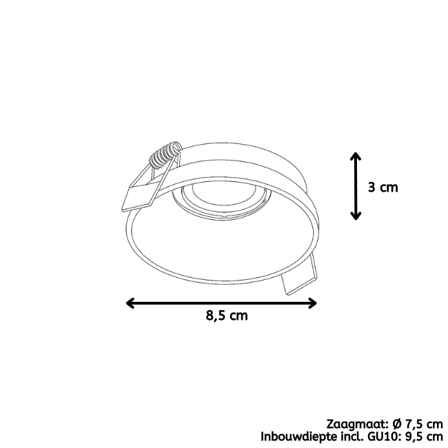Inbouwmaten | Zaagmaat: Ø 7,5 cm Inbouwdiepte incl. GU10: 9,5 cm |