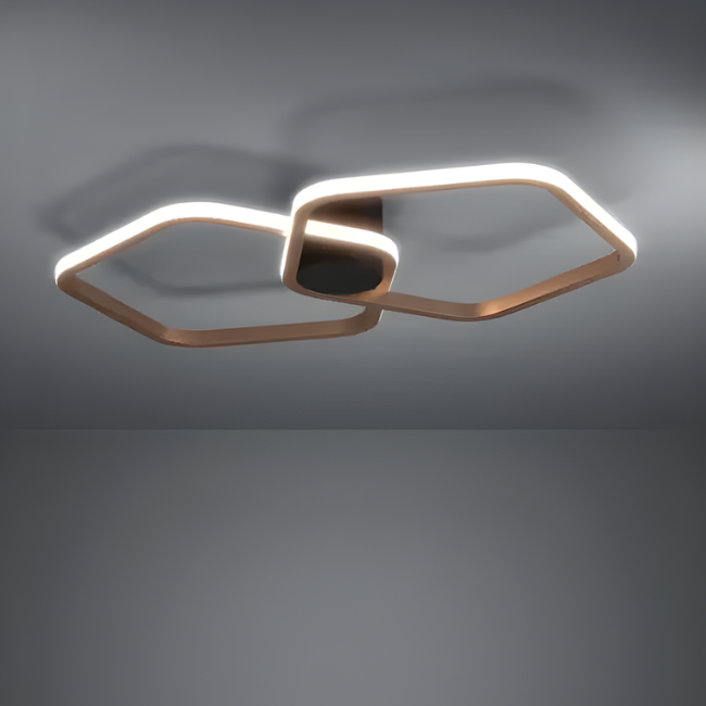 De Estrella 2-lichts plafondlamp brengt luxe hotel chique sfeer in elke ruimte. Het unieke ontwerp bestaat uit twee asymmetrische LED-ringen die speels met elkaar zijn verweven. De hoogwaardige bronzen afwerking geeft de lamp een warme, verfijnde uitstraling die perfect past binnen moderne, elegante en high-end interieurs.