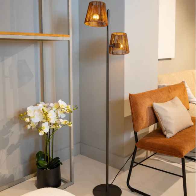 Ben je op zoek naar een vloerlamp die niet alleen functioneel is, maar ook een echte blikvanger in je interieur? Vloerlamp Daan is precies wat je nodig hebt! Deze lamp is perfect voor de woonkamer of slaapkamer en voegt een warme, stijlvolle touch toe aan elke ruimte. Dankzij de combinatie van geweven touwkappen en een bruin metalen frame heeft deze vloerlamp een unieke uitstraling die past bij zowel een Scandinavisch als bohemien interieur.
