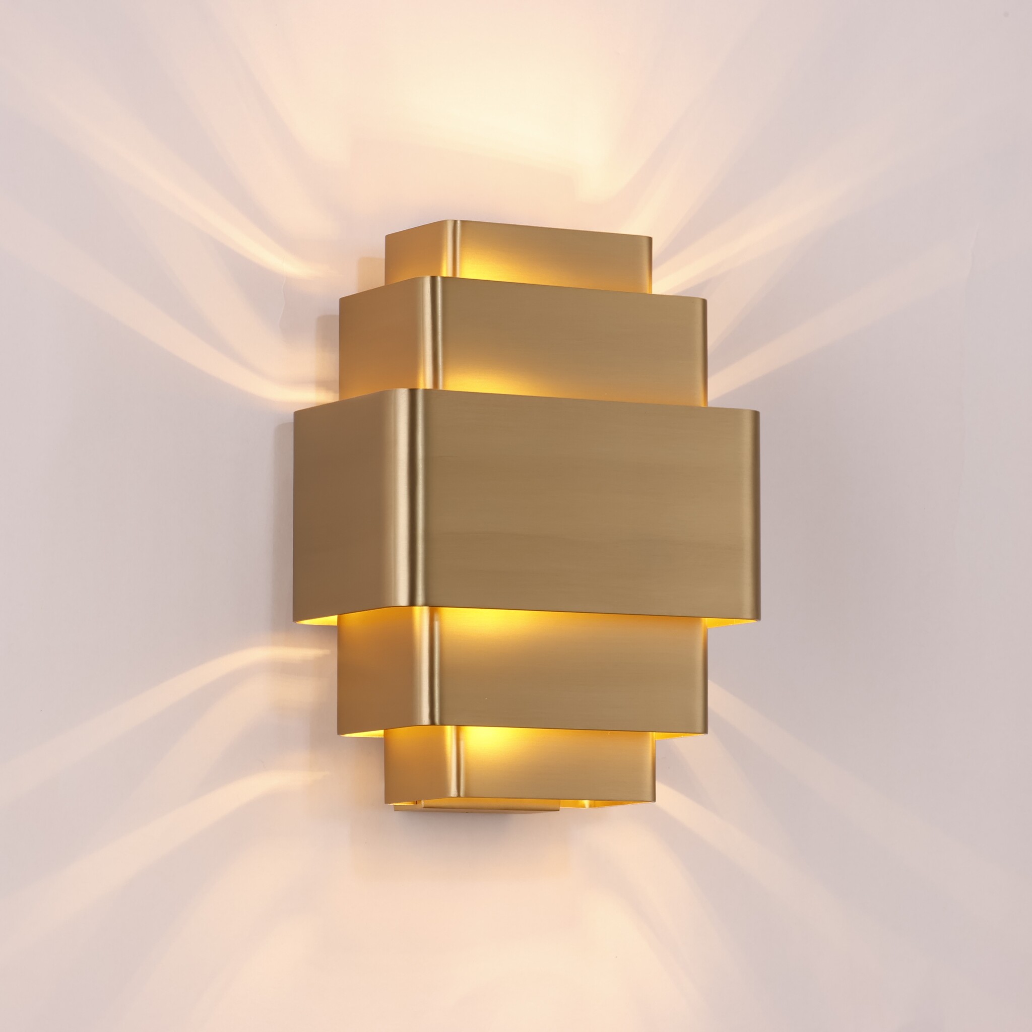 Deze wandlamp Layers 3-lichts is vervaardigd met hoogwaardige materialen, wat zorgt voor duurzaamheid en een lange levensduur. De gouden kleur voegt een warme en uitnodigende glans toe aan elke ruimte, terwijl de strakke lijnen en vormen een modern en artistiek accent bieden.