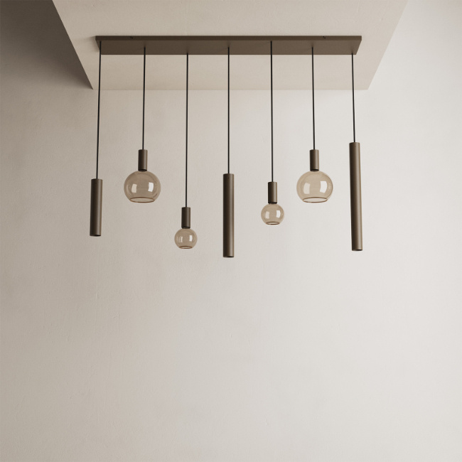 De moderne platina hanglamp Riva heeft verschillende fittingen (4x E27, 3x GU-10) hangend op verschillende hoogtes. Dit geeft een modern en speels contrast. De lamp afmetingen zijn b 145 cm x d 22 cm x h 120 cm. De cilindervormige kokers zijn bij deze uitvoering van platina staal.