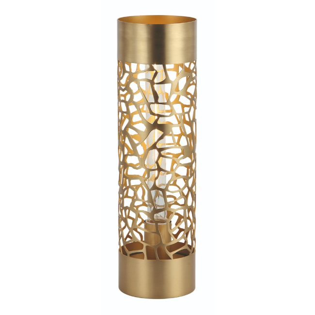 Maak kennis met de Freelight tafellamp Giraffa, een elegante lamp die direct opvalt door haar unieke design. De Giraffa is uitgevoerd in een chique goudkleur en heeft een opengewerkt patroon dat doet denken aan het mozaïek van een giraffe, wat een subtiele speelse uitstraling geeft zonder afbreuk te doen aan het luxe karakter.