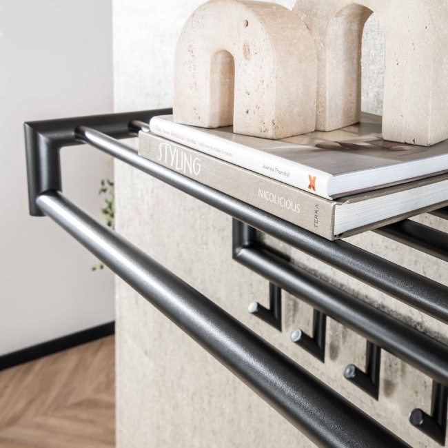 De kapstok Tiyu combineert een strak ontwerp met praktische functionaliteit. Uitgevoerd in donkergrijs mat gepoedercoat staal straalt dit model een moderne, industriële sfeer uit. Dankzij de stevige wandmontage biedt de kapstok ruimte en stevigheid in gebruik.