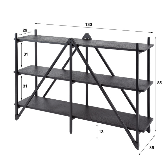 Met een breedte van 130 cm biedt de kast drie royale open schappen voor het uitstallen van decoratieve objecten, boeken of planten. De karakteristieke diagonale metalen elementen aan de voorzijde geven de kast een grafisch accent en extra stevigheid.