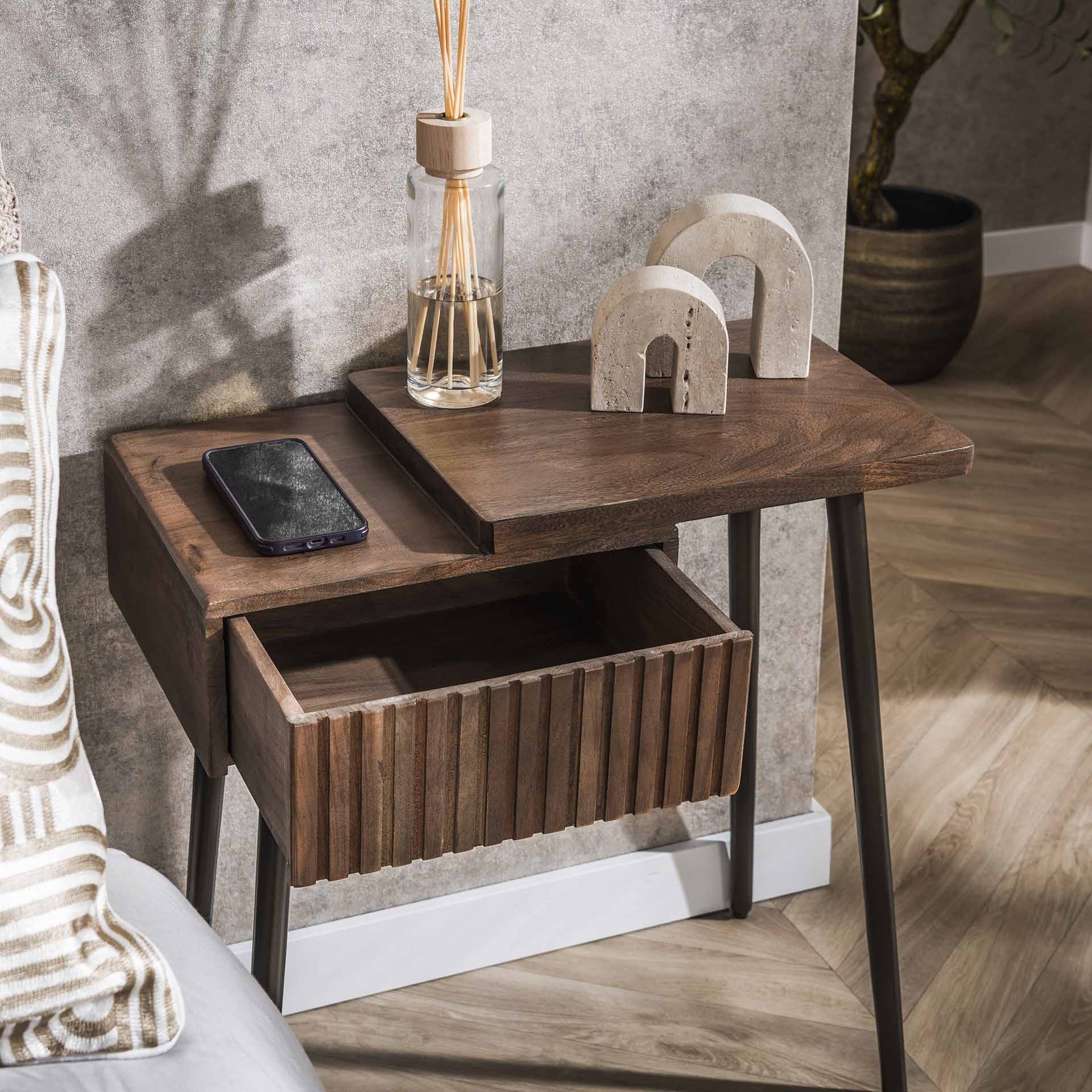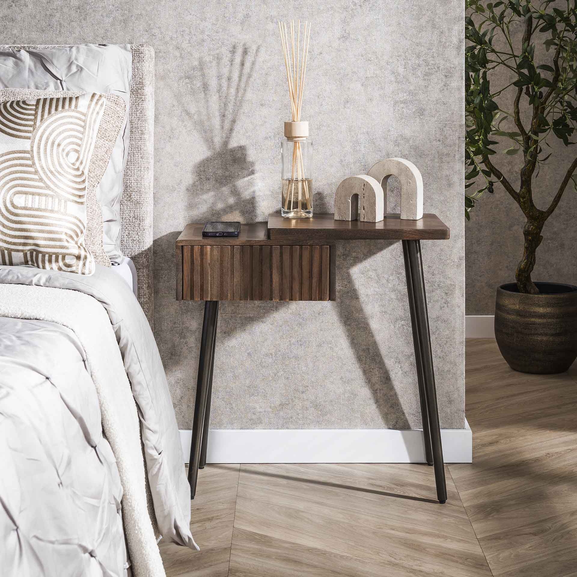 Het metalen onderstel is gepoedercoat in een bronzen kleur die prachtig contrasteert met het warme hout. Dankzij de compacte vormgeving en de praktische lade is Carve niet alleen decoratief, maar ook functioneel. De lade biedt voldoende opbergruimte voor kleine items zoals sieraden, boeken of accessoires.