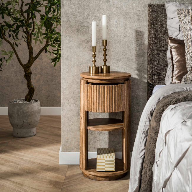 Het landelijk moderne nachtkastje Drex XS rond is gemaakt van massief mangohout en afgewerkt in een warme zandkleurige tint. Het ronde ontwerp met een subtiel verticaal golfpatroon rondom geeft het meubel een stijlvolle en natuurlijke uitstraling die perfect past in een modern en rustig interieur.