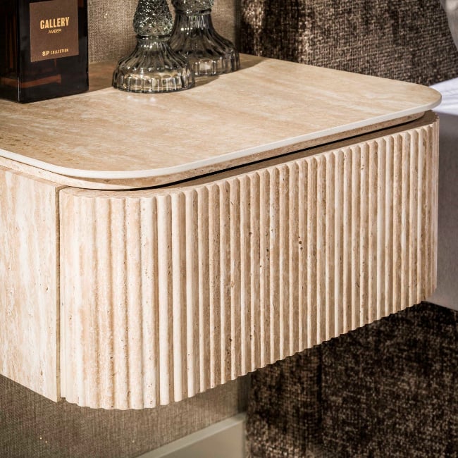 Het bovenblad is uitgevoerd in keramiek met een travertin-look, wat zorgt voor een natuurlijke en exclusieve uitstraling. De praktische lade biedt voldoende ruimte om kleine spullen netjes op te bergen, terwijl het minimalistische ontwerp rust brengt in de slaapkamer.