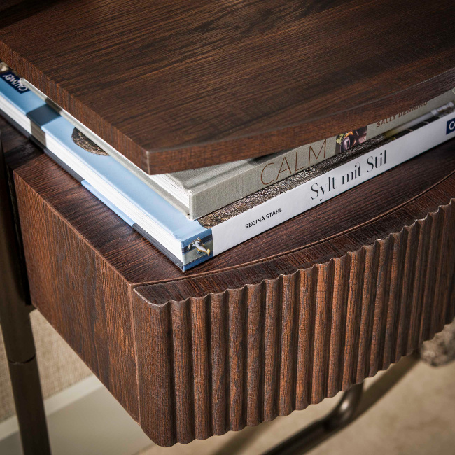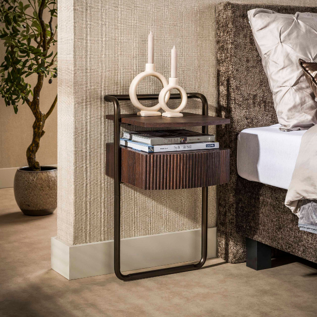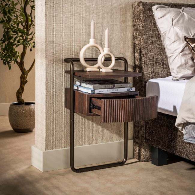 Het hotel chique moderne nachtkastje Seth combineert warme houttinten met een elegant metalen frame. De lade is uitgevoerd in donkerbruin eikenhout-look en heeft een subtiel gebogen front met een fijn wave-profiel, wat het ontwerp een luxe en verfijnde uitstraling geeft.