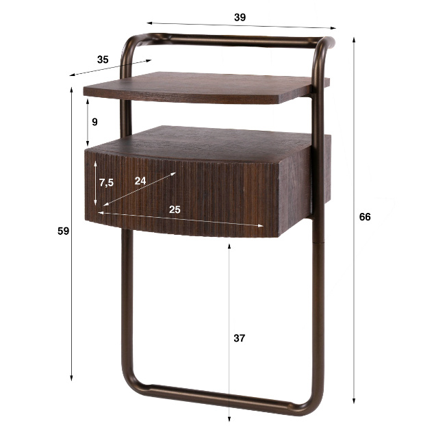 Het bronzen gepoedercoate metalen buisframe omsluit de lade en de legplank en zorgt voor een luchtig en modern silhouet. De combinatie van houtlook en metaal past perfect in een hotel chique, modern of warm industrieel interieur.