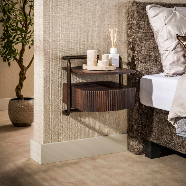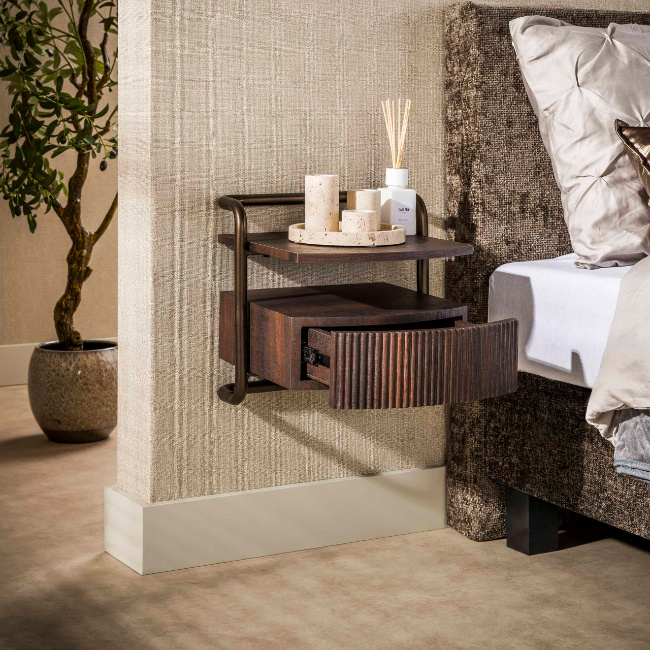 Dankzij de zwevende montage blijft de vloer vrij en oogt de slaapkamer ruimtelijk. Het nachtkastje wordt eenvoudig aan de muur bevestigd via twee geïntegreerde bevestigingsoogjes. Dit model maakt deel uit van de Seth-serie en biedt praktische opbergruimte voor boeken, accessoires of een nachtlamp.