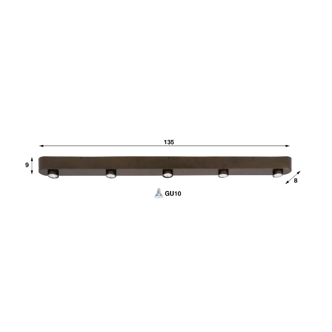 De lamp is geschikt voor vijf GU10 lichtbronnen (niet meegeleverd). Hiermee kun je zelf de gewenste lichtsterkte en lichtkleur bepalen. De spots geven gericht licht naar beneden, waardoor werkbladen, kookeilanden of looppaden goed worden verlicht. De opbouwspot maakt deel uit van de Bar-serie en is bovendien goed te combineren met andere Sienna brown armaturen in het interieur.