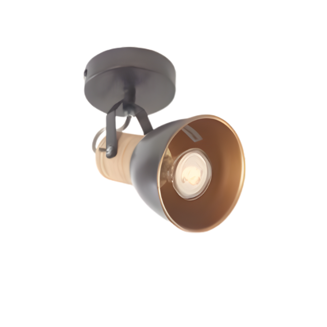 De opbouwspot Veleno 1-lichts combineert op elegante wijze natuurlijke en industriële elementen. De combinatie van zwart metaal en hout zorgt voor een warme, eigentijdse uitstraling die perfect past binnen landelijke en industriële interieurs. De binnenzijde van de kap is subtiel goudkleurig afgewerkt, wat zorgt voor een sfeervolle, zachte lichtweerkaatsing.
