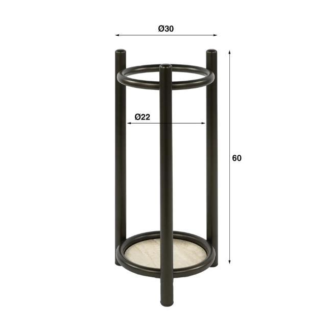 De stevige ronde basis is voorzien van een natuurstenen inzet, die niet alleen stabiliteit biedt maar ook praktisch is voor het opvangen van vocht. De verticale staanders houden paraplu’s netjes rechtop, waardoor ze goed kunnen drogen en overzichtelijk blijven opgeborgen.