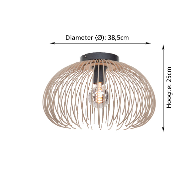 Dankzij de diameter van 38,5 cm verspreidt de Alhabia lamp het licht gelijkmatig door de kamer. De open structuur zorgt ervoor dat een decoratieve LED-lamp of filamentlamp goed tot zijn recht komt, wat een extra warme en uitnodigende sfeer creëert.
