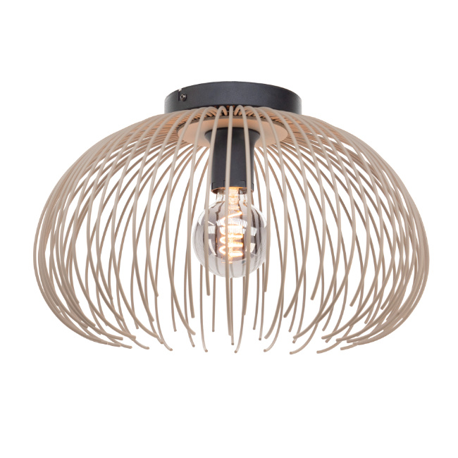 De plafondlamp Alhabia straalt eenvoud en moderne elegantie uit. Met zijn open draadframe in een warme zandkleur creëert deze lamp een speels schaduwpatroon op het plafond en de muren. Het compacte formaat maakt hem ideaal voor kleinere ruimtes waar stijl en lichtcomfort belangrijk zijn.