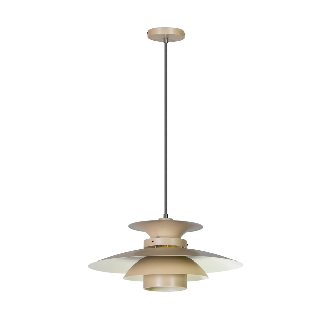 De lamp heeft een unieke gelaagde vorm, die zowel modern als retro aanvoelt, en verspreidt een aangenaam, diffuus licht dat zorgt voor een warme en uitnodigende sfeer in de ruimte. Het ontwerp straalt een vintage charme uit, terwijl de neutrale kleuren ervoor zorgen dat de lamp moeiteloos kan worden geïntegreerd in diverse interieurs, van modern tot klassiek.