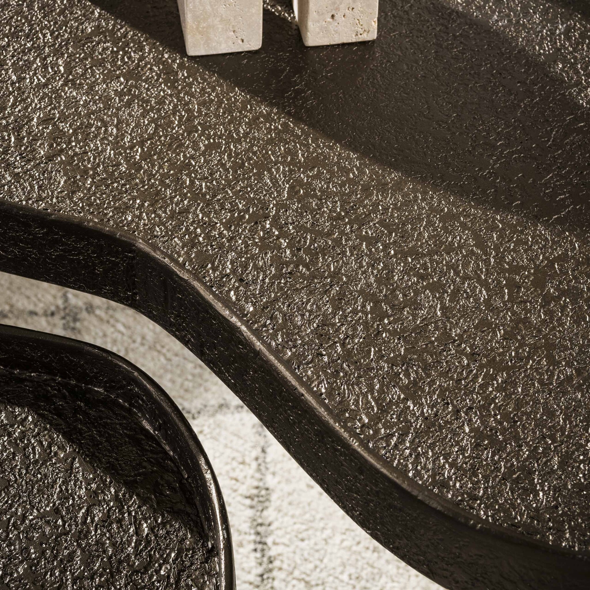 Salontafelset Conco brengt een harmonieuze mix van elegantie, speelsheid en moderne luxe in de woonkamer. Door de niervormige bladen krijgt het ontwerp een zachte, organische uitstraling die direct warmte toevoegt aan het interieur. De opstaande rand zorgt daarbij niet alleen voor een stijlvol detail, maar houdt ook decoratie zoals kaarsen, boeken of accessoires netjes op hun plek. Met de rijke bronskleurige metallic afwerking trekken de tafels subtiel de aandacht zonder te overheersen.