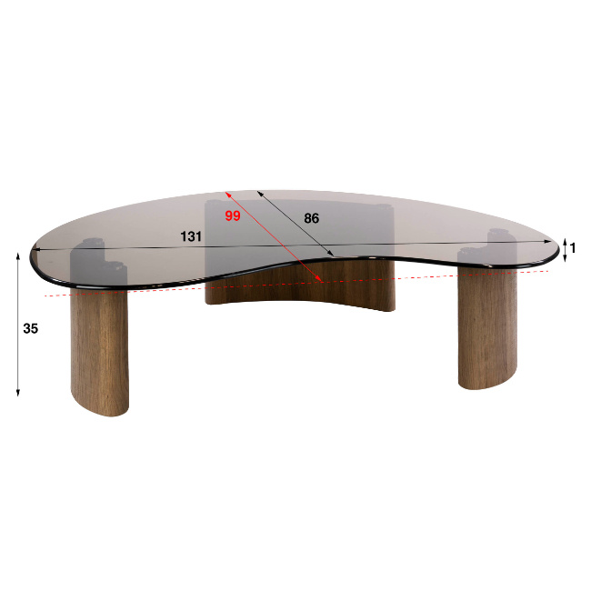De tafel staat op eikenhout-look poten die de vloeiende vorm van het blad volgen. Dit zorgt voor een harmonieus en modern ontwerp. Dankzij het royale formaat van 130 cm is deze salontafel ideaal als blikvanger voor een ruime zithoek.