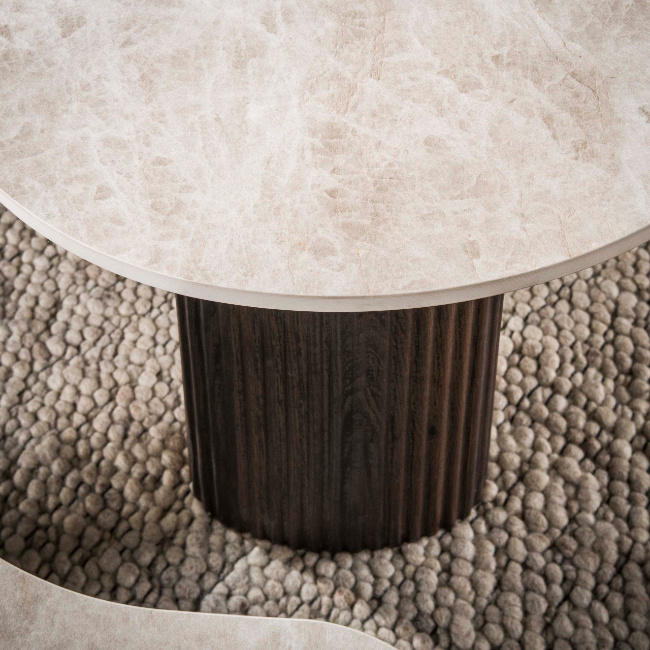 De onderstellen zijn uitgevoerd in een donkerbruine houtlook met een karakteristiek wave-profiel. De ronde poten sluiten met hun vloeiende lijnen aan op de vorm van de bladen, waardoor de tafels een harmonieus en modern geheel vormen.