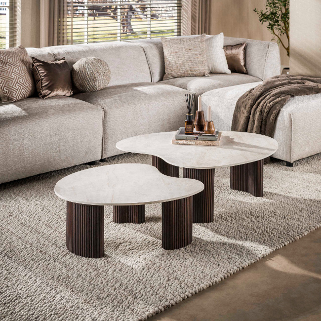 De moderne salontafel Sierra set van 2 combineert organische vormen met een luxe uitstraling. De tafels zijn voorzien van 3D-keramische bladen in Taj Mahal-look, wat zorgt voor een natuurlijke steenstructuur en een elegant, licht kleurbeeld in de woonkamer.