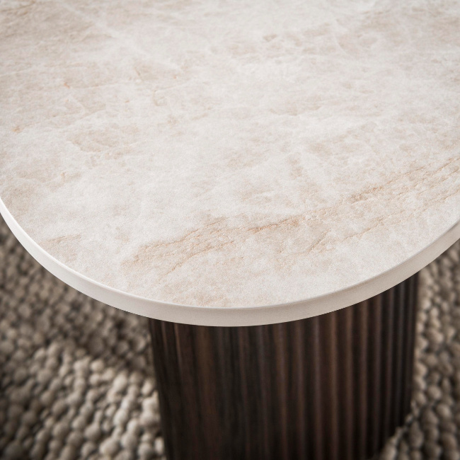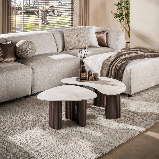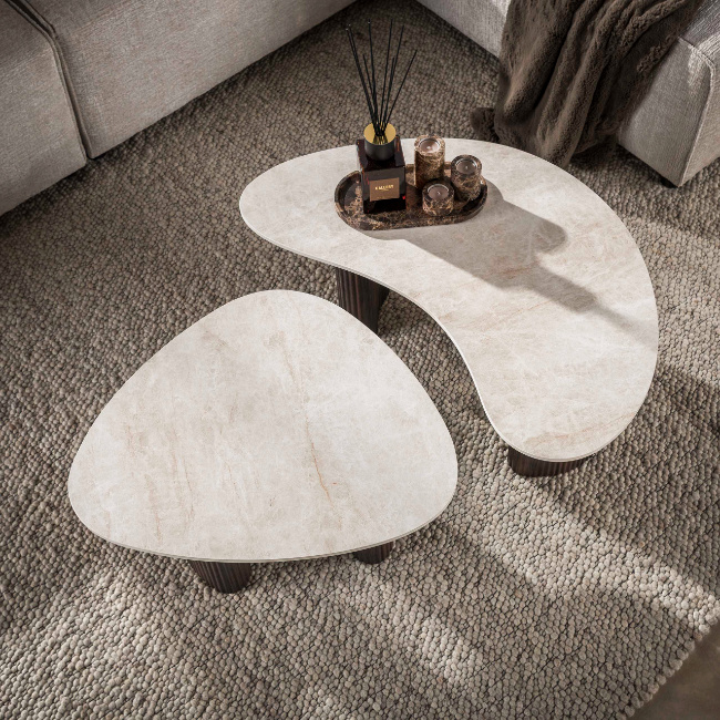 De moderne salontafel Sierra set van 2 combineert organische vormen met een elegante natuursteenlook. De tafels zijn voorzien van 3D-keramische bladen in Taj Mahal-look, een lichte steenstructuur met subtiele aders die zorgt voor een rustige en luxe uitstraling in de woonkamer.