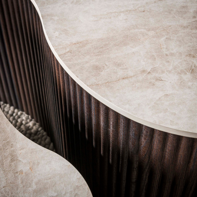 Dankzij het sterke keramische oppervlak zijn de tafelbladen krasbestendig, hittebestendig en onderhoudsvriendelijk. Hierdoor zijn de tafels perfect voor dagelijks gebruik. De set kan samen of los geplaatst worden en past perfect in een modern, hotel chique of organisch interieur.