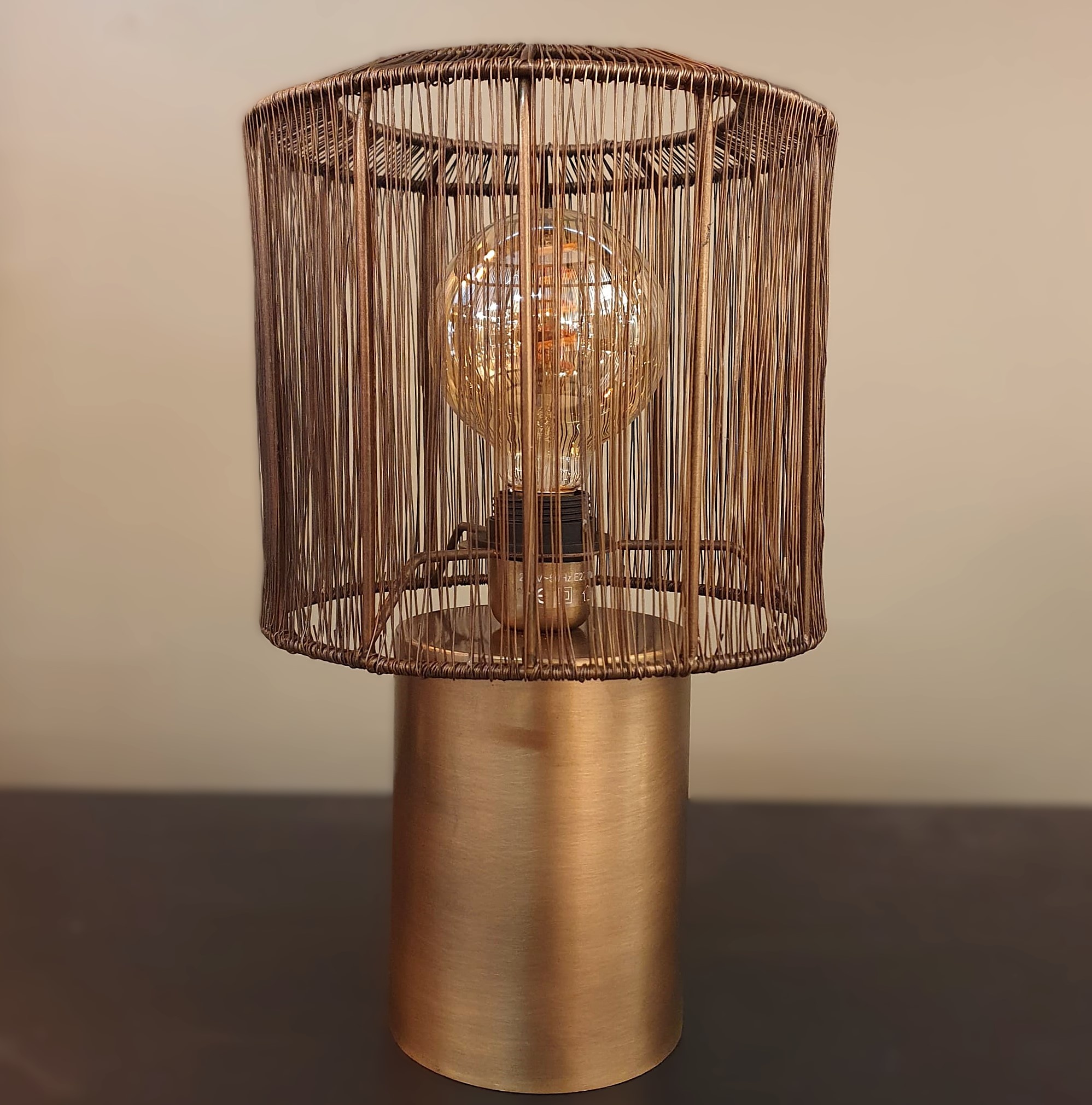 Tafellamp Bronzi is een stijlvolle combinatie van strakke lijnen en warme metallic tinten. De metalen kap met dunne draden zorgt voor een uniek lichtspel op de muur en geeft de ruimte een warme en gezellige sfeer. Dankzij de antique brass afwerking straalt de lamp luxe en elegantie uit.