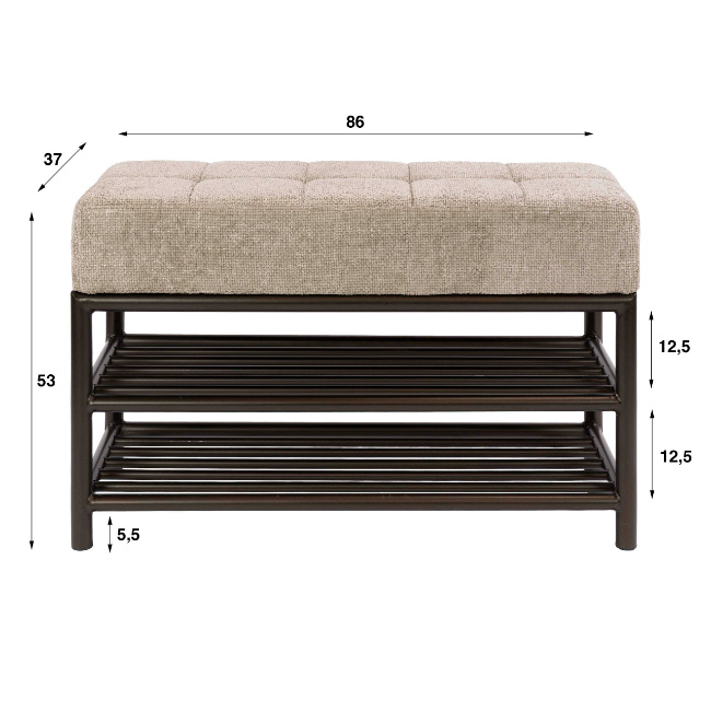 Onder de comfortabele zitting bevinden zich twee ruime schoenenrekken, waardoor je meerdere paren schoenen netjes kunt opbergen. De zitting maakt het bovendien gemakkelijk om schoenen aan of uit te trekken.