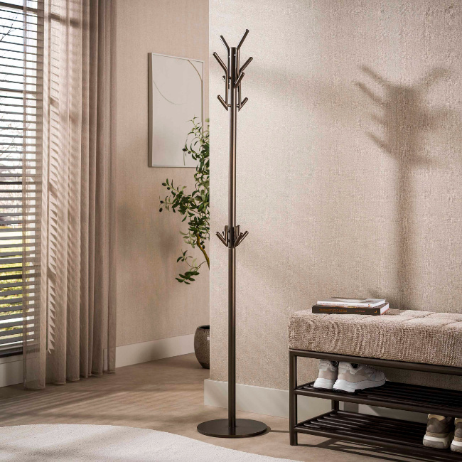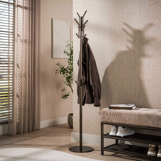 De staande kapstok Lema heeft een strak en tijdloos ontwerp dat perfect past in de hal of entree. Het stevige stalen frame in drift brown geeft de kapstok een warme en moderne uitstraling.