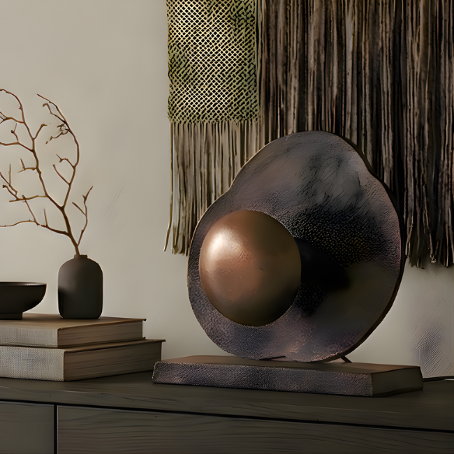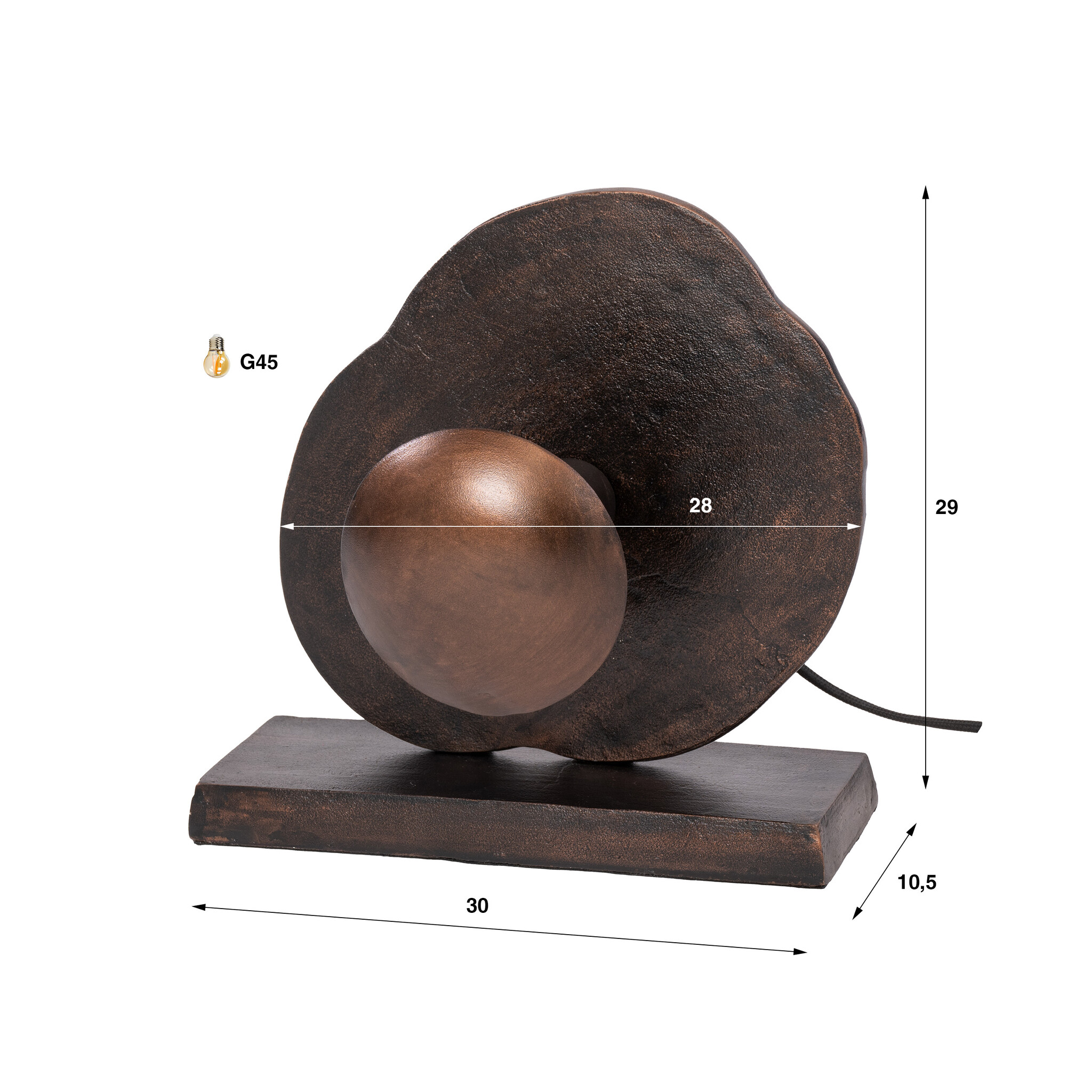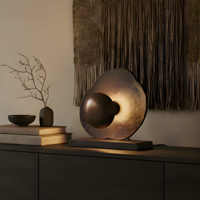 De tafellamp Earth in antiek koper is een echte blikvanger met een robuuste en industriële uitstraling. Het organisch gevormde achterpaneel in combinatie met de ronde kap geeft de lamp een uniek en karaktervol design dat direct sfeer toevoegt aan je interieur.