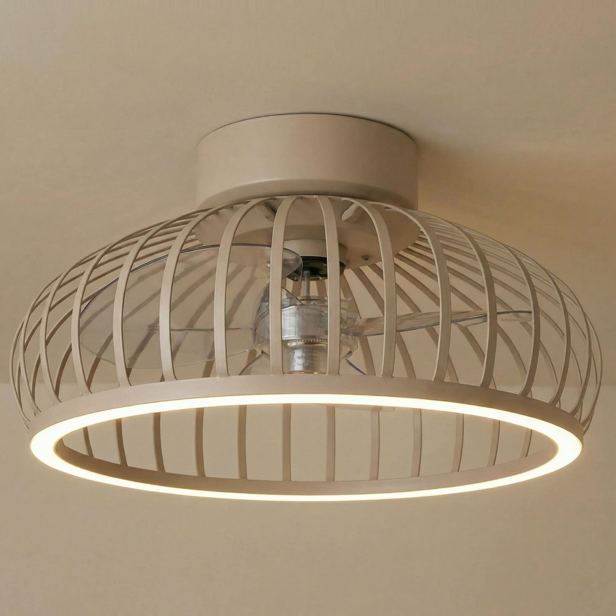 De plafondventilator Breeze combineert moderne verlichting met comfortabele luchtcirculatie. Het armatuur in zandkleur met een open metalen frame geeft de lamp een lichte Scandinavische uitstraling die goed past in een modern interieur.
